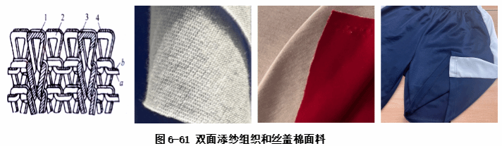 (1)两面效应添纱面料:由于利用不同纤维纱线或不同外观、不同色彩的纱线分布编织地纱(呈现在织物反面)与添纱(呈现在织物正面),使织物呈现正、反面外观与性能不同的特点。另外还可以按用途不同设计两面效应织物,市场上比较常见的丝盖棉就是其中一种,面料正面为涤纶丝,反面为棉,正面光泽较好、耐磨性好,反面吸湿性好、手感柔软、亲肤性好,面料比较挺括,丝盖棉面料是运动服、休闲服的理想面料,双面添纱组织和丝盖棉面料及服装如图6-61所示,其中,1、3为正面线圈纵行,2、4为反面线圈纵行,a为地纱,b为面纱。