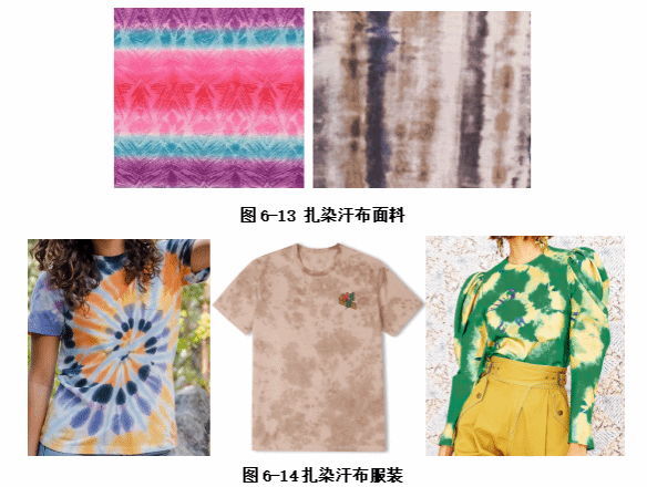 (7)扎染汗布:吸水性强的汗布,还可以通过扎染工艺形成特色扎染效果的汗布,扎染汗布和服装如图6-13和6-14所示。