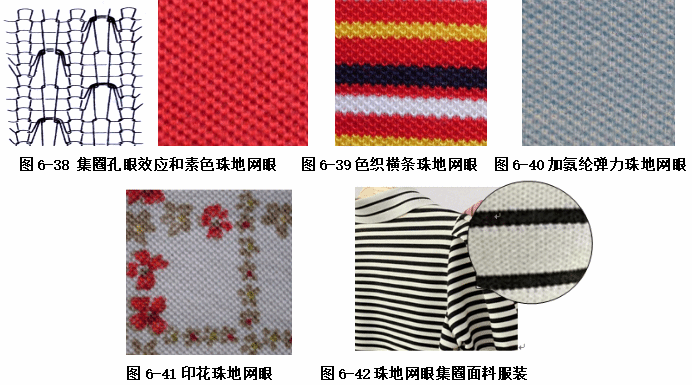 (2)珠地网眼集圈面料:珠地网眼是市场上比较常见的一种集圈类针织面料,为针织单面圆机所织。可采用纯色形成素色珠地网眼,如图6-38所示,可采用色纱编织形成色织横条珠地网眼,如图6-39所示,可加氨纶形成弹力珠地网眼,如图6-40所示,也可在珠地网眼面料上印花形成印花双珠地网眼,如图6-41所示。珠地网眼又分单珠地网眼和双珠地网眼两种,布面具有明显的凹凸效果,透气、透湿性好,保型性好。多采用棉、棉涤混纺、莫代尔、竹纤维等原料,是针织T恤、Polo衫、休闲外套、运动服等针织服装的常用面料,如图6-47所示。