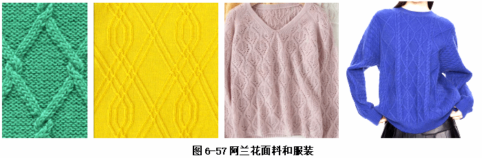 利用移圈的方式使两个相邻纵行上的线圈相互交换位置,在织物中形成凸出于织物表面的倾斜线圈纵行,组成菱形、网格等各种结构花型被称为阿兰花。阿兰花通常和绞花搭配设计,用于粗针面料较多,常用的纱线原料有毛、棉、腈纶、涤纶及其混纺等。阿兰花面料常用于毛衫产品,阿兰花面料和服装如图6-57所示。