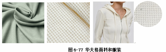 在罗纹的基础上增加凸条和浮线单元可形成类似华夫饼效果的面料,面料层次分明、肌理感强,可用于圆领卫衣、连帽卫衣、卫裤、短裤、套装等服装,华夫格面料和服装如图6-77。