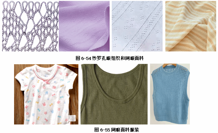 根据花纹要求,将某些针上的线圈移到相邻针上,使被移处形成孔眼效应,被称为空花或挑花。如图6-54所示,在单面纬平针基础上通过移圈形成了各种网眼及镂空效果。网眼类花色别致,针织面料质地轻薄,透气性好,可用于春夏季T恤或时装等,含棉或莫代尔等纤维素纤维原料的网眼面料适用于夏季婴幼儿服装,如图6-55所示。