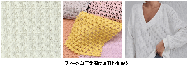 (1)单面集圈网眼面料:一般集圈列数愈高(以不超过5列为宜),凹凸效应愈明显,织物网孔增大,单针多列集圈面料和服装,集圈点交叉分布,编织密度较松,具有明显的网眼效果,适合做春夏季服装,如图6-37所示。