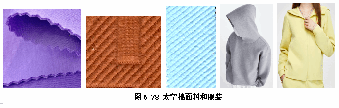 采用纬编圆机在纬平针、衬纬、罗纹组织的基础上复合而成的一种针织面料,太空棉具有三层结构,中间衬入高弹丝形成空气夹层,面料整体具有立体感。普通太空棉两表面光洁,绗缝太空棉表面具有绗缝效果,图案变化丰富、肌理感强。太空棉面料轻薄、保暖性好、亲肤性好、不易变形,适合做春秋季卫衣、裤子、套装等各类服装,太空棉面料和服装如图6-78所示。