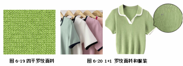 (2)1+1罗纹面料:运用精梳棉原料编织的精梳棉1+1罗纹手感手软,亲肤性好,弹力大,适用于制作贴着穿着的打底服装,1+1罗纹面料及其服装如图6-20。