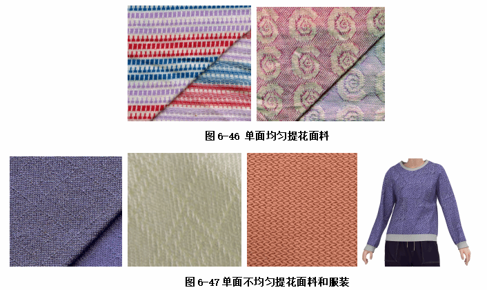 单面提花又叫浮线提花或虚线提花,织机背面不选针,有单色、双色、多色等不同效果。由平针线圈和浮线组成。有均匀和不均匀两种结构形式。单面均匀提花正面由色彩不同的线圈组合形成花纹图案,反面有浮线,单面均匀提花实物图如图6-46所示。单面不均匀提花一般为单色,正面具有拉长线圈,反面具有浮线,有时可利用反面凸起的浮线效果,将面料反面作为花纹效应面。单面不均匀提花实物图如图6-47所示。单面提花面料手感柔软,悬垂性好,弹性较好,轻薄,适用于男装或女装T恤衫、时装等。采用较细的棉纱与粘胶长丝交织,或棉与锦纶、涤纶有光长丝交织的单面提花面料可用于妇女背心、内裤、胸衣、睡衣、睡裙等。涤纶、锦纶长丝纶包芯纱交织的弹力提花面料,弹性优越,可用作各种时装、泳衣、妇女紧身面料等。