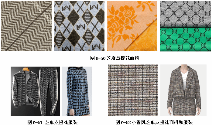 (2)芝麻点提花:反面芝麻点双面提花组织的反面为均匀点状分布的V形线圈,所有纱线在正面按照花型要求出针编织,并且不管色纱数多少,织物反面每个横列的线圈都是由两种色纱编织而成,并呈一隔一排列,其正反面线圈纵密差异随色纱数不同而异,当色纱数为2时,正反面线圈纵密比为1:1;色纱数为3时,正反面线圈纵密比为2:3。在这些组织中,因两个成圈系统编织一个反面线圈横列,因此正反面的纵向密度差异较小。且由于织物反面不同色纱线圈分布均匀,减弱了“露底”的现象。市场上的芝麻点提花针织面料和服装较为常见,如图6-50、图6-51所示。芝麻点提花面料布面平整,花色效果丰富,厚实挺括,不同图案不同原料的芝麻点提花面料可广泛用于各种不同风格的针织服饰。如图6-52所示为小香风芝麻点提花面料和服装,所用纱线为花式纱,在芝麻点提花的基础上添加衬纬纱线编织而成,该面料花色丰富,尺寸稳定性好。