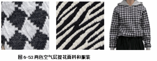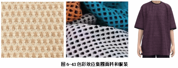 (3)色彩效应集圈面料:当集圈采用色纱编织时,利用悬弧被拉长的(不脱圈)线圈所遮盖而呈现在织物反面特点,可产生花纹所要求的色彩效应,如图6-43所示为两色提花效应集圈面料和服装。