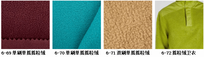 根据风格种类可分为:单刷单摇、双刷单摇、双刷双摇等类型。摇粒绒面料手感柔软蓬松、轻盈、保暖性好、不宜掉毛、易护理,适宜制做内衣、睡衣、浴衣等家居服装以及卫衣、夹克等休闲外套,还可以做冲锋衣内胆的保暖服装。摇粒绒面料如图6-69至6-71所示,摇粒绒卫衣如图6-72所示。