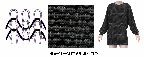 平针衬垫组织以纬平针为地组织,衬垫纱按照一定规律编织成不封闭圈弧挂在地组织上。如图6-64所示,平针衬垫面料所用纱线较细,密度较稀疏,适合做春夏季女T恤、裙装等。