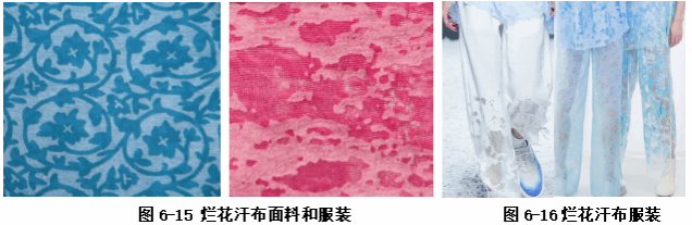 (8)烂花汗布:烂花工艺是通过在面料上刮印可以腐蚀原料成份的化学品,并经焙烘、水洗,使腐蚀、焦化后的纤维被洗除,得到半透明的花纹图案,具有刺绣效果,常见的有用酸来烂人棉、棉。烂花汗布面料有凹凸立体感,在烂花的地方薄、透,面料轻盈、飘逸、透气、装饰性强,多用于男女时装,烂花汗布和服装如图6-15和6-16。