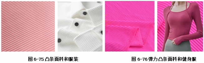 当一个针床握持线圈时,另一个针床连续编织可以在织物表面形成凸条纹理,布面风格似一级一级的楼梯,俗称楼梯布。凸条面料厚实,肌理感强,采用棉质纱线编织而成的凸条面料尺寸稳定性好,适合制作卫衣卫裤,各类休闲装,如图6-75。采用锦纶、氨纶编织而成的凸条面料弹性好,适合做健身服,如图6-76。
