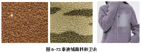 (3)泰迪绒:外形和泰迪犬皮毛类似,毛短且卷曲,光泽性好,生产原料多为涤纶,通过后期拉松形成卷曲毛绒,一般克重较大,面料厚实,保暖性好,可用于制作秋冬季卫衣、外套等,泰迪绒面料和卫衣如图6-73。