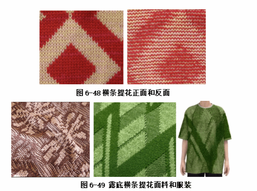 (1)横条提花:反面横条提花织物的反面为单色横条循环,所有纱线在正面按照花型要求出针编织,这种提花织物正反面线圈的高度有差别,色纱数愈多,正反面纵密的差异就愈大,从而会影响正面花纹的清晰及牢度。因此,设计与编织横条反面双面提花组织时,色纱数不宜过多,一般2-3色为宜。图6-48为横条提花的正反面实物图。图6-49为露底横条提花面料。