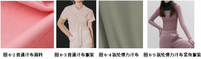 (2)氨纶弹力汗布:由氨纶丝和另外一根纱如棉或涤纶同时编织成圈的结构,氨纶弹力汗布的延伸性和弹性好,适用于紧身内衣、运动衣等面料,用于女装多于男装,体现女性身体曲线柔美姿态,尼龙加氨纶的汗布常被应用于游泳服装。氨纶弹力汗布和服装如图6-4和6-5所示。