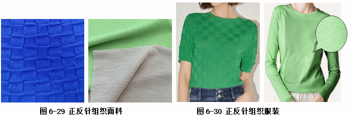改变正面线圈和反面线圈的配置可以形成不同花纹且有凹凸感的变化双反面组织,该组织原理简单且在电脑横机上容易实现,在针织面料设计上的应用较多。图6-29所示为正反针组织的实物图。图6-30为正反针织组织服装。