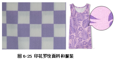 (6)印花罗纹面料:在罗纹面料基础上进行印花处理可形成各种图案的罗纹面料,即保留了罗纹自身弹力好的特点,又增加了罗纹面料的花色效果,印花罗纹面料和服装如图6-25。