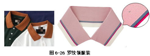 (7)罗纹领:罗纹领可以通过用横机或圆机编织而成,横机罗纹领通常针距较大(一般为16G以下针距),布面较粗,密度较紧,手感硬挺,两面风格基本一致,两端和边缘可织光边,横机领实物图如图 所示。圆机罗纹领一般细针距较多(15G-20G),密度相对稀疏,纹路细密,手感较柔软,两面风格粗细稍有差异,一般为多层、双层折叠应用,用折边做领边,圆机领的服装如图6-26 所示。