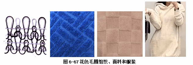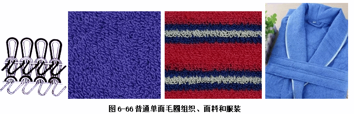 普通毛圈组织是指每一个毛圈线圈的沉降弧都被拉长形成毛圈。毛圈线圈的拉长沉降弧竖立在织物的反面,地纱线圈显露在织物正面并将毛圈纱的线圈覆盖。这可以防止在穿着和使用过程中毛圈纱从正面被抽出,尤其适合于要对毛圈进行剪毛处理的天鹅绒织物。图6-66为普通毛圈针织面料和浴袍。