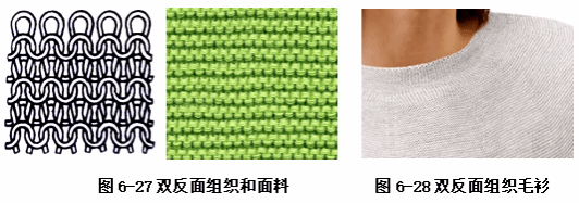 1+1双反面组织由一个横列正面线圈和一个横列反面线圈交替编织而成。双反面组织由于弯曲的圈柱力图伸直,导致织物两面的线圈圈弧向外突出,而圈柱凹陷在里面,因而当织物不受外力作用时,在织物两面,看上去都呈现出圈弧状外观,类似于纬平针组织的反面,故称双反面组织。在双反面组织中,由于线圈圈柱朝垂直于织物平面方向倾斜,使织物纵向缩短,因而增加了织物的厚度与纵向密度,且在纵向具有很大的弹性和延伸性,使织物纵横向延伸性相近。与纬平针组织一样,双反面组织可以在边缘横列顺、逆编织方向脱散,双反面组织和面料如图6-27,双反面毛衫如图6-28。