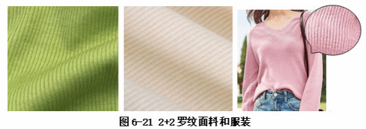 (3)2+2罗纹面料:2+2罗纹正反面坑条效果明显,横向弹力大,多用于服装领口、袖口、下摆等边口位置或者弹力衫,2+2罗纹面料和服装如图6-21。