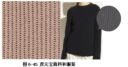 2.双元宝面料:也叫畦编、鱼鳞,集圈在织物的两面形成,两面外观相同,面料厚实、手感柔软、蓬松,适用于做秋冬季服装以及装饰性荷叶边,如图6-45所示。