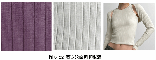 (4)宽罗纹面料:正面线圈数和反面线圈数差异较大的宽罗纹在市面上也较常见,常用于制作紧身T恤等女装,宽罗纹面料和服装如图6-22。