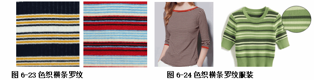 (5)色织横条罗纹面料:不同种类的罗纹组织都可以通过改变纱线颜色编织而成横条纹效果。色织横条罗纹面料如图6-23所示,其服装如图6-24所示。