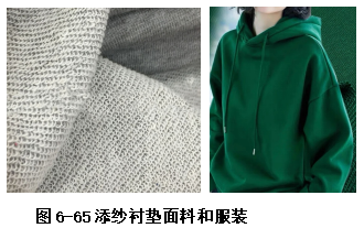 添纱衬垫组织由面纱、地纱和衬垫纱编织而成。地纱与面纱形成添纱纬平针,衬垫纱按一定比例形成悬弧与浮线。与平针衬垫中衬垫纱处在沉降弧上易显露在正面纵行间不同,添纱衬垫组织中的衬垫纱处于地纱的沉降弧上、面纱的沉降弧下,而被夹在中间。这样,不仅增加了衬垫纱在布面上的固着牢度,而且因衬垫纱被面纱遮盖而不显露在织物正面,因此改善了织物外观。所以,生产中大多采用添纱衬垫组织。市场上添纱衬垫面料也叫三线卫衣面料或毛圈布,常用于做男女童等的卫衣,添纱衬垫面料和服装如图6-65示。添纱衬垫面料脱散性较小,有破洞后不易扩散,横向延伸性较小,织物的宽度、织物的厚度和保暖性均增加。经拉绒后,织物形成的绒面使手感更加柔和,能起到较好的保暖效果。