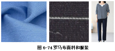 是一种复合纬编针织面料,在双面大圆机上编织而成,也叫潘扬地罗马布,俗称打鸡布。罗马布在普通双面机上编织生产,四路一个循环,织针按普通双罗纹(棉毛)方式排列织针就可以了。第1F、2F是编织双罗纹组织(棉毛组织);第3F是针盘织针不参加工作,针筒织针全部参加编织;第4F是针筒针参加编织。罗马布面呈现暗横条,较挺括,悬垂性好,耐脏耐洗,穿着舒适,适合做针织外套和针织裤类产品,罗马布面料和服装如图6-74所示。