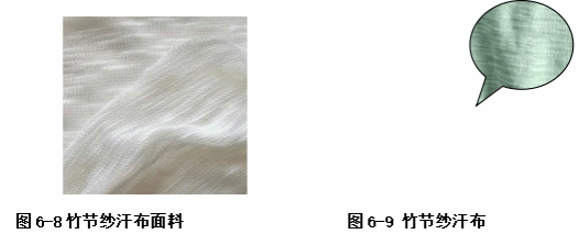 (4)竹节汗布:竹节纱线忽粗忽细,用竹节纱原料编织而成的汗布面料布面均匀分布着类似竹节一样的凸起,形成了特殊纹理和风格,花型突出,风格别致。竹节纱有三个最主要的参数:节和节之间的距离;节的长度;节最粗的地方和最细的地方的规格,这些参数影响着竹节汗布的风格,竹节汗布和服装如图6-8和6-9。