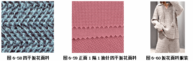 花色毛圈组织是指通过毛圈形成花纹图案和结构效应的毛圈组织。它按照花纹要求,在部分线圈中形成毛圈,从图中可看出:在一隔一横列排列的毛圈间夹着呈一定配置的不拉长的沉降弧,在织物上形成了具有凹凸效应的花色外观。图6-67所示为单面花色毛圈组织和服装。