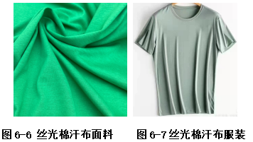 (3)丝光棉汗布:指纱线经过丝光处理或面料经过丝光工艺处理的棉汗布,即纱线或面料在有张力的情况下,经过烧碱处理而成。丝光棉汗布手感更顺滑、不易起球、抗皱性好、挺阔性和保型性更好,穿着爽滑,有着丝绸般的光泽度,染色性能高,染色后色彩鲜艳,不易掉色。丝光棉汗布和服装如图6-6和6-7。
