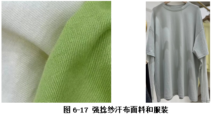(9)强捻纱汗布:采用强捻精梳纱编织而成的纬平针面料具有麻纱感,手感凉爽,吸湿性好,硬挺有身骨,尺寸稳定性好,是高档时装、职业装的理想面料。强捻纱汗布和服装如图6-17所示。
