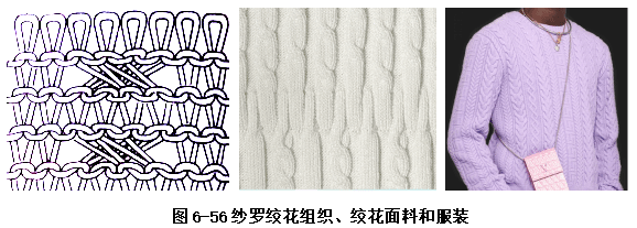 如果将两组相邻纵行的线圈相互交换位置,就可以形成绞花效应,俗称拧麻花,绞花组织装饰性强,是常见的针织花型。根据相互移位的线圈纵行数不同,可编织2×2、3×3等绞花。图6-56所示为绞花针织面料。绞花针织面料一般常用粗针机编织,形成的绞花效果明显,在针织毛衫上比较常用,也有圆机生产的绞花面料用于休闲服装或家具装饰等。
