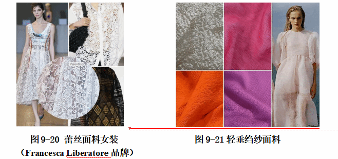 (5)轻垂绉纱面料:柔软垂感面料用独特的粉质手感和清爽弹性垂感风靡春夏季,缎背绉、细纱珠地、皱纱式纹理与罗纹斜纹布,搭配天丝、铜氨丝和纤维素纱线织物。如图9-21 所示。
