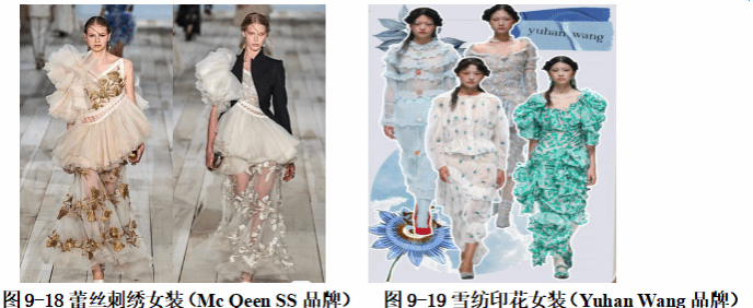 (4)骨线蕾丝面料:在朴素精致风格的双层风格影响下,纯真花卉图案、心形图案蕾丝和饰边设计展露浪漫怀旧风格。超轻柔软的绣花蕾丝适用于梦幻复古和意趣个性的裙装、小衫款式,搭配高捻纱打造丝柔手工质感。采用撞色或重磅纱制作精细图案与零散空花图案,花形上的纱线高捻勾边设计,呈现勾勒轮廓的精致效果,使蕾丝、空花绣和刺绣面料符合夏季轻薄、清新的趋势走向。如图9-20。