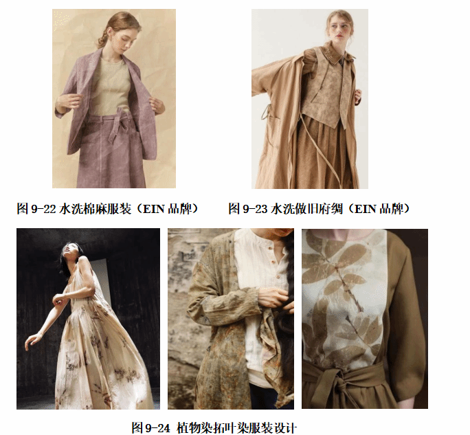 (4)植物浆料丝网印花:材质上以有机棉、丝、麻等天然材料为主,工艺上使用来自天然的植物染料,呈现大自然的颜色,清新自然安全,对皮肤无害。将植物研磨并制成植物浆料,将制作好的丝网网板,放置在面料上,使用植物浆料进行手工刷色,使得丝网印花层次丰富,可设计田园风格服装。如图9-24所示。