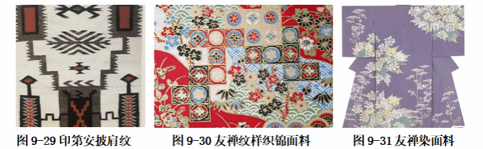(5)东方民俗文化面料:代表亚洲的东方风格有汉服、韩服、和服、旗袍等服饰风格。和服图案纹样称为友禅纹样,将不同题材以复合方式组合。题材有:松鹤、扇面、樱花、龟甲、红叶、青海波、竹叶、秋菊、牡丹、兰草、梅花等,表现方式有:印染、手描、刺绣、扎染、蜡染、揩金。如图9-30和9-31所示。