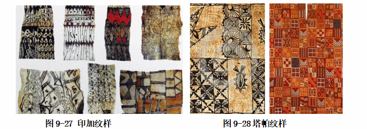 (3)塔帕纹样面料:塔帕是南太平洋岛屿一种用树皮制成的非纺织布料,粗犷、古拙。方式有:一是手绘,用植物烧成炭制成黑色染料在布上绘制;其二用树叶、石片或竹片制成模板,在布上刷漆或染色。如图9-28所示。