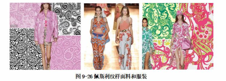 (1)佩斯利纹样面料:佩斯利、腰果花等民俗风元素随着复古风的浪潮再次映入人们的视线,鲜艳的色彩与外轮廓,醒目的民俗花卉,经过设计师的再塑造拥有了别样的新意。佩慈利纹样起源于印度,原始形态起源认为是印度生命之树,菩提树叶的造型。在中国称为火腿纹样,西方称佩慈利纹样。如图9-26所示。