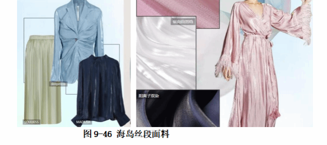 (2)玻璃丝段面料:琉璃丝段又称人鱼姬渐变面料,具有焕彩光泽,适用于新中式风格和酷炫时尚风格单品,面料柔软波光粼粼,主要有真丝、粘胶、醋酸、涤纶,工艺采用撞色配色、表面洒金色,风格体现新潮国风、酷炫时尚、柔软顺滑、焕彩光泽。用于小礼服、时尚衬衫、时尚礼服、摇滚风格服饰等。如图9-44。
