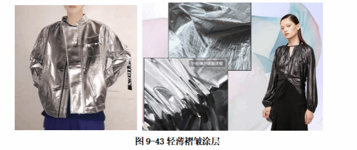 (1)机能涂层面料:主要有涤纶、锦纶,工艺采用涂层、烫银、压褶,具有金属质感的光泽诠释未来风格,适用于街头潮酷感单品。例如抹胸、夹克、裤装、裙子、小礼服、套装等,轻微自然褶皱,镜面PU光泽。如图9-43。