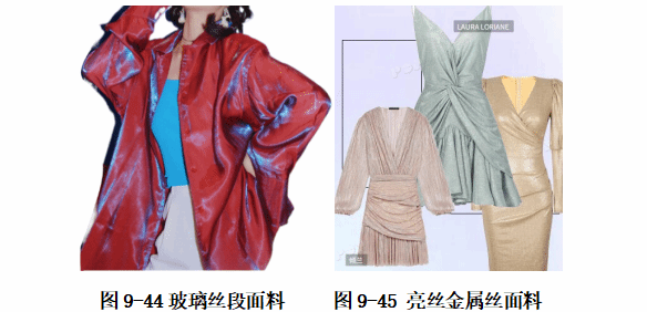 (3)亮丝金属丝面料:面料轻薄柔软,光泽感柔和适用于营造低调奢华的视觉感受,科技光感,适用于衬衫、裙装、外套。如图9-45。