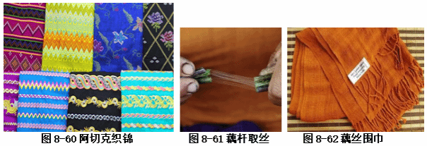 藕丝织锦是缅甸特有的莲梗丝织品。莲花纤维直径仅有3至5微米,是世界上最细的纺织纤维之一,手艺人用刀绕着藕杆轻割一周拉开,捋出数条藕丝搓成细绳,如图8-61然后再用这些细绳纺成线用以织布。当地人表示,通常织造一小块方巾(图8-62)需消耗4000根荷花茎。