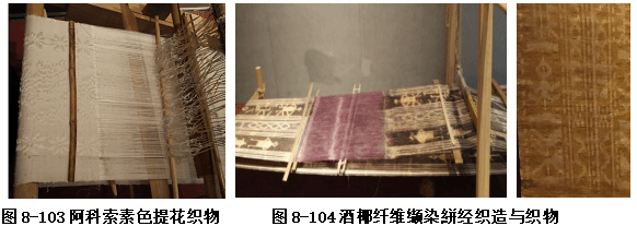 织造前先按图案扎染酒椰纤维的经纱,再絣经织造,缬染絣经织物如图8-104。