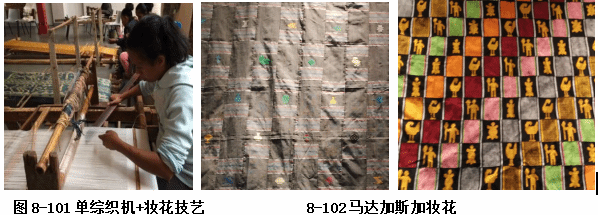 马达加斯加织机类型丰富,其中最常用的是单综织机,如图8-101。几乎全部采用白经彩纬、纬线显花、过管挖花的妆花技术。自然开口和提花开口是通过操纵开口木杆形成的,东南部的一些部落则使用腰机,马达加斯加代表性妆花织物,以块格纹样为特色,通经断纬织造,难度大,色彩艳丽,对比强烈,以人物和动物、植物题材为主,充满岛国风情,如图8-102。
