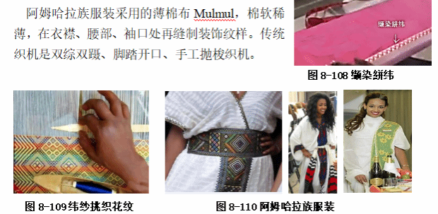 阿姆哈拉民族服装的面料花纹装饰有三种方式:缬染纬纱絣织、色纬在机上挑花与面料绣花。
