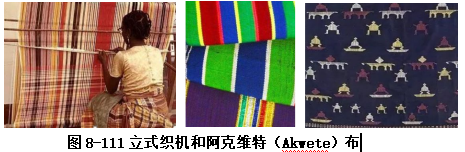 由妇女采用立式织机织布。使用多种颜色的经纱可产生混合的颜色彩的虹色效果。当经纱是一种颜色为底色,而纬纱提供花纹所需颜色,织物可编织为单面或双面,阿克维特布的立式织机和面料如图8-111。