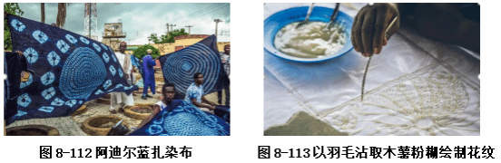 约鲁巴族妇女也会在未染色的棉布表面,涂上木薯粉糊,待糊干掉之后拿去染色,涂有面糊的部分则不会染上蓝色,使布匹上的花纹更精美,如图8-113。